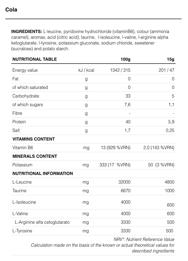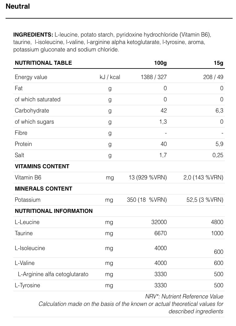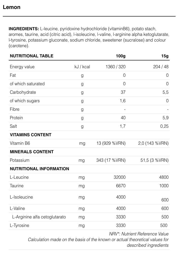 Formulated with BCAA, essential amino acids in an 8:1:1 proportion as well as tyrosine, taurine and arginine. Perfect for helping in muscle recovery and in reducing fatigue after training.