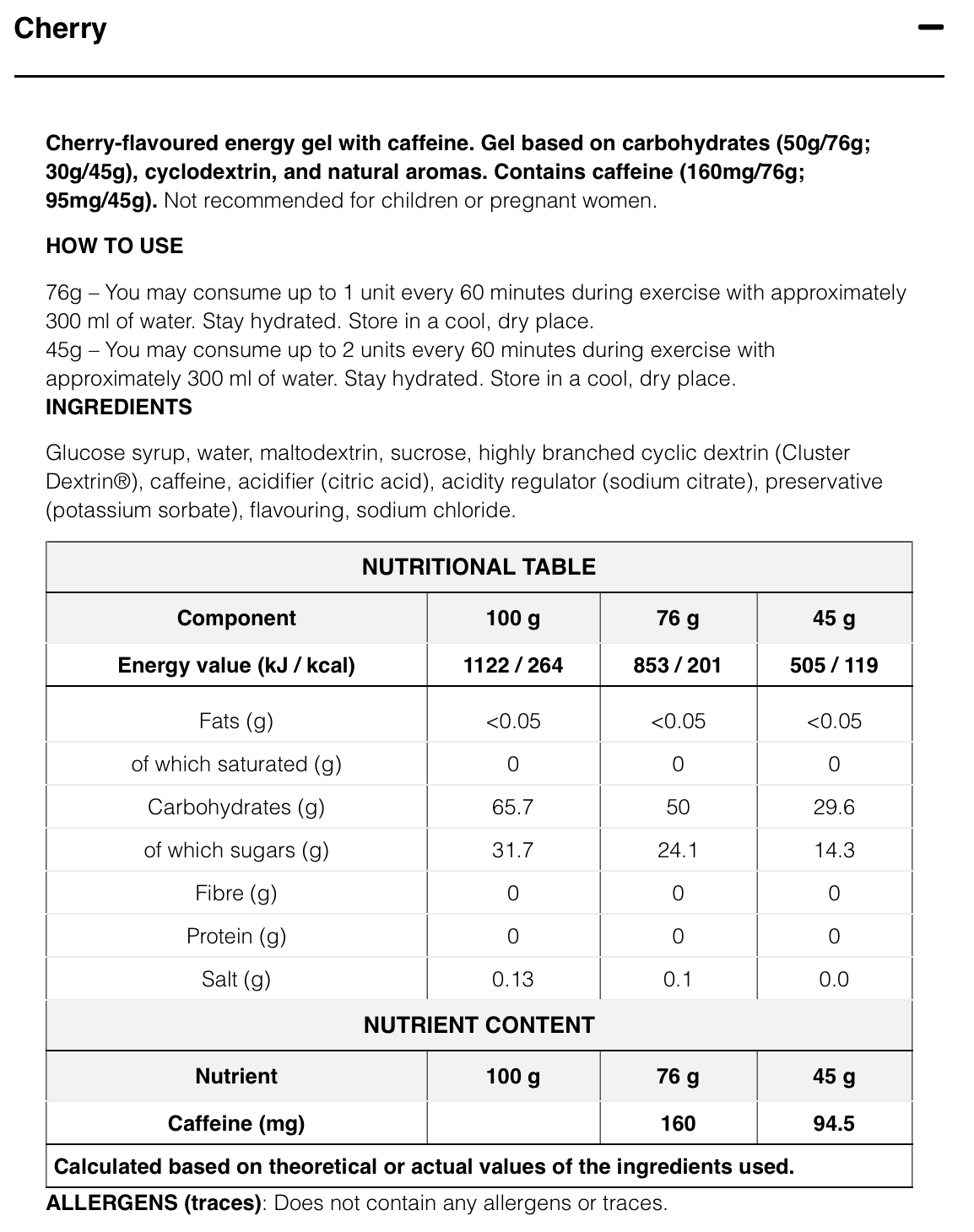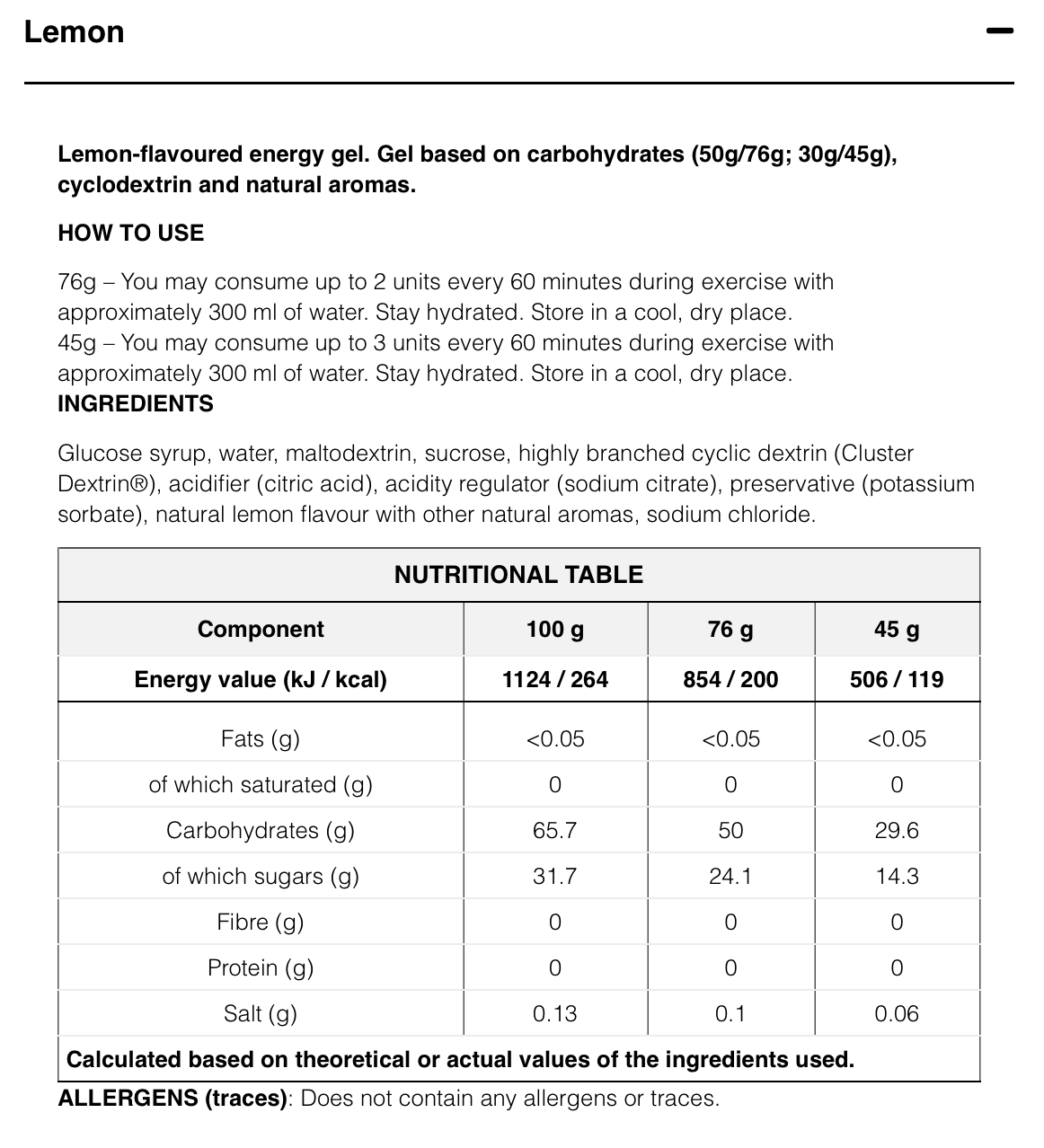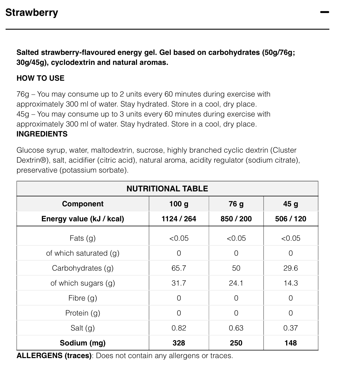Each 76 g gel contains 50 g of carbohydrates, and the XS 45 g format provides 30 g of carbohydrates.