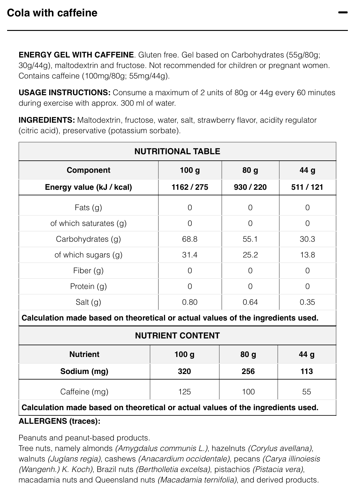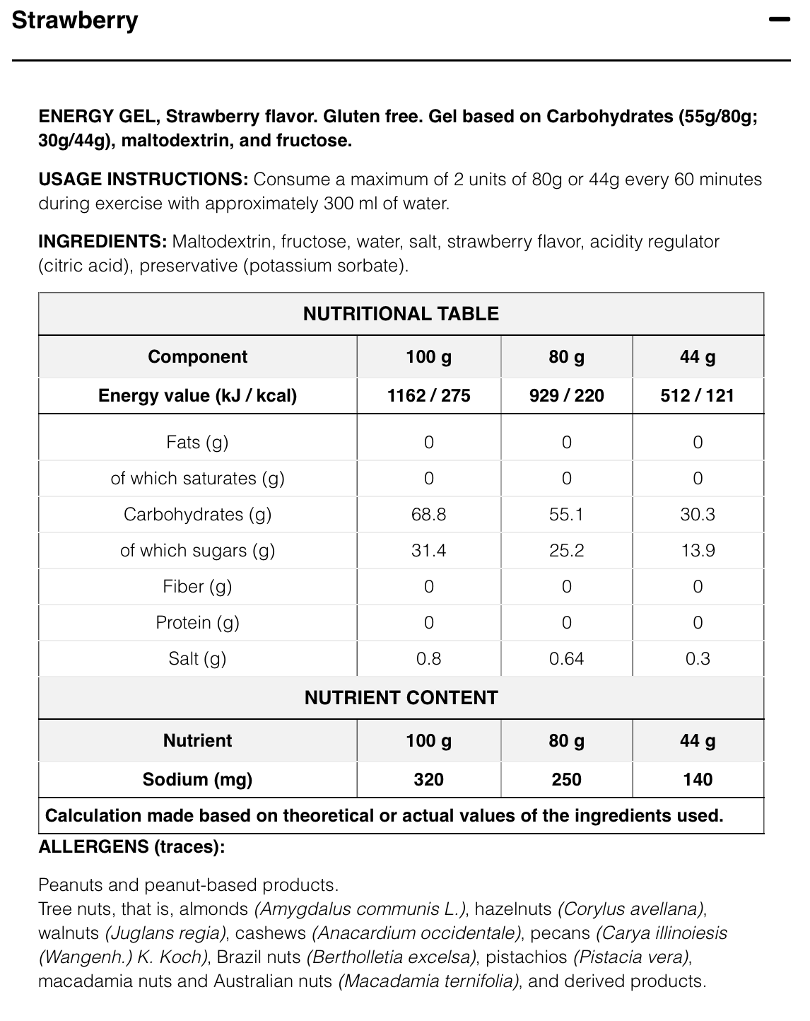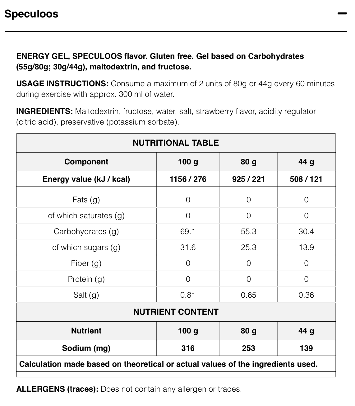 High Fructose Gel provides a 55 g supply of carbohydrates and 250 mg of sodium per gel from the maltodextrin and fructose, in a proportion of 10:8.