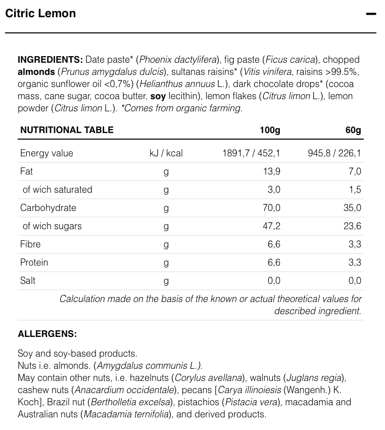 They contain only natural ingredients such as figs, almonds and other organic ingredients such as dates and raisins. No sugars, syrups or aromas have been used. The flavours are obtained naturally from fruits, spices, cocoa, etc.