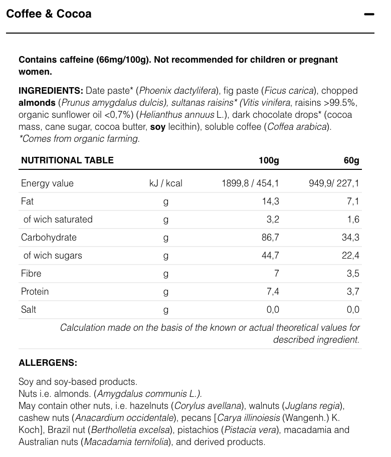 Each 60g bar delivers more than 200 kcal and provides around 35 g of easily absorbed carbohydrates thanks to its natural formulation.
