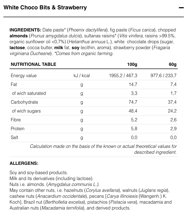 - White Choco Bits Strawberry: with white chocolate chips and strawberry powder. (Due to the milk content in the white chocolate chips, this flavour is not suitable for vegans or for the lactose-intolerant).