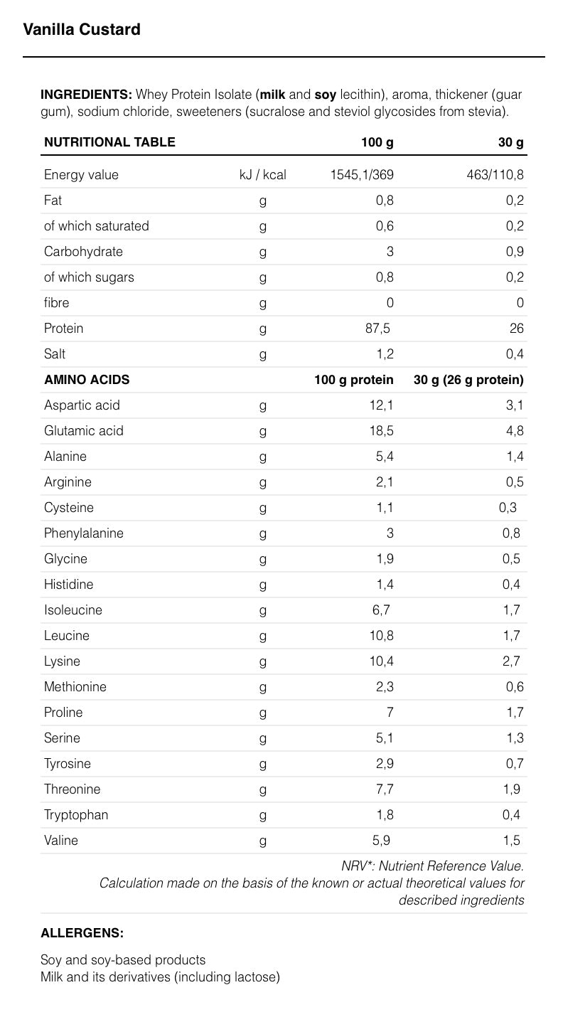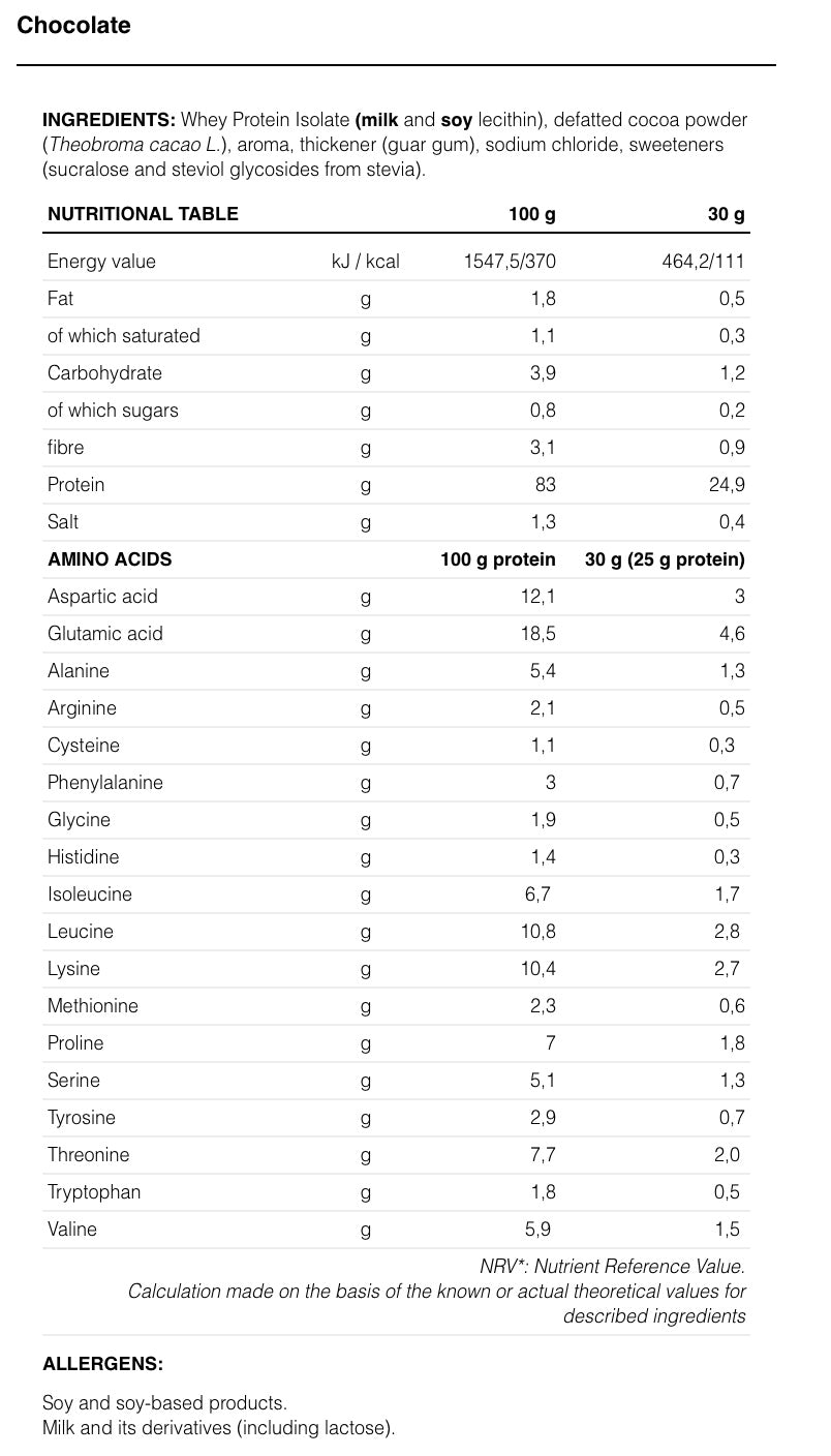 Each dose provides 110 Kcal, around 25g of protein, only 3g of carbohydrates and 0.2 g of sugar. It is also low in lactose, to a percentage below 1%.