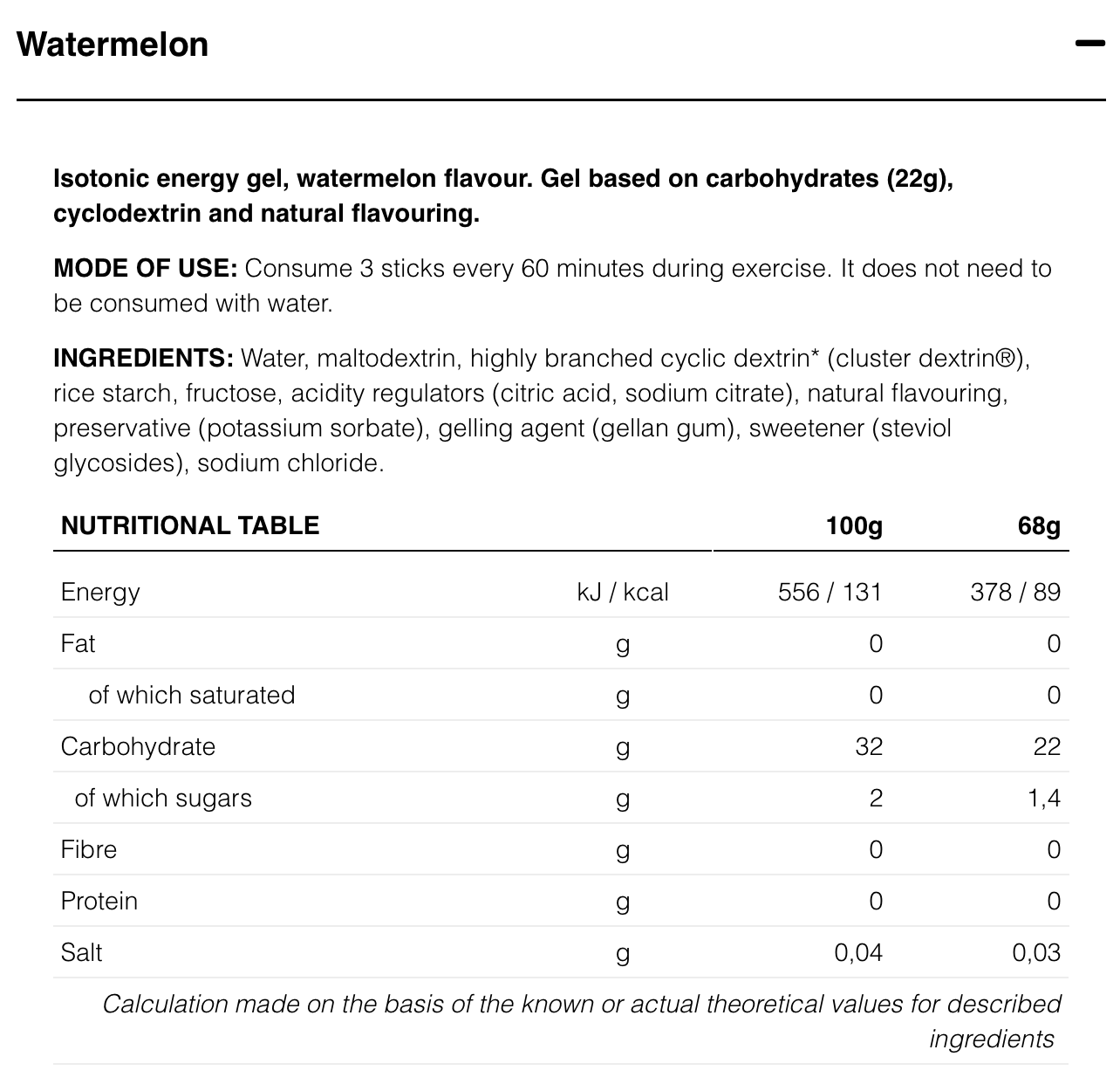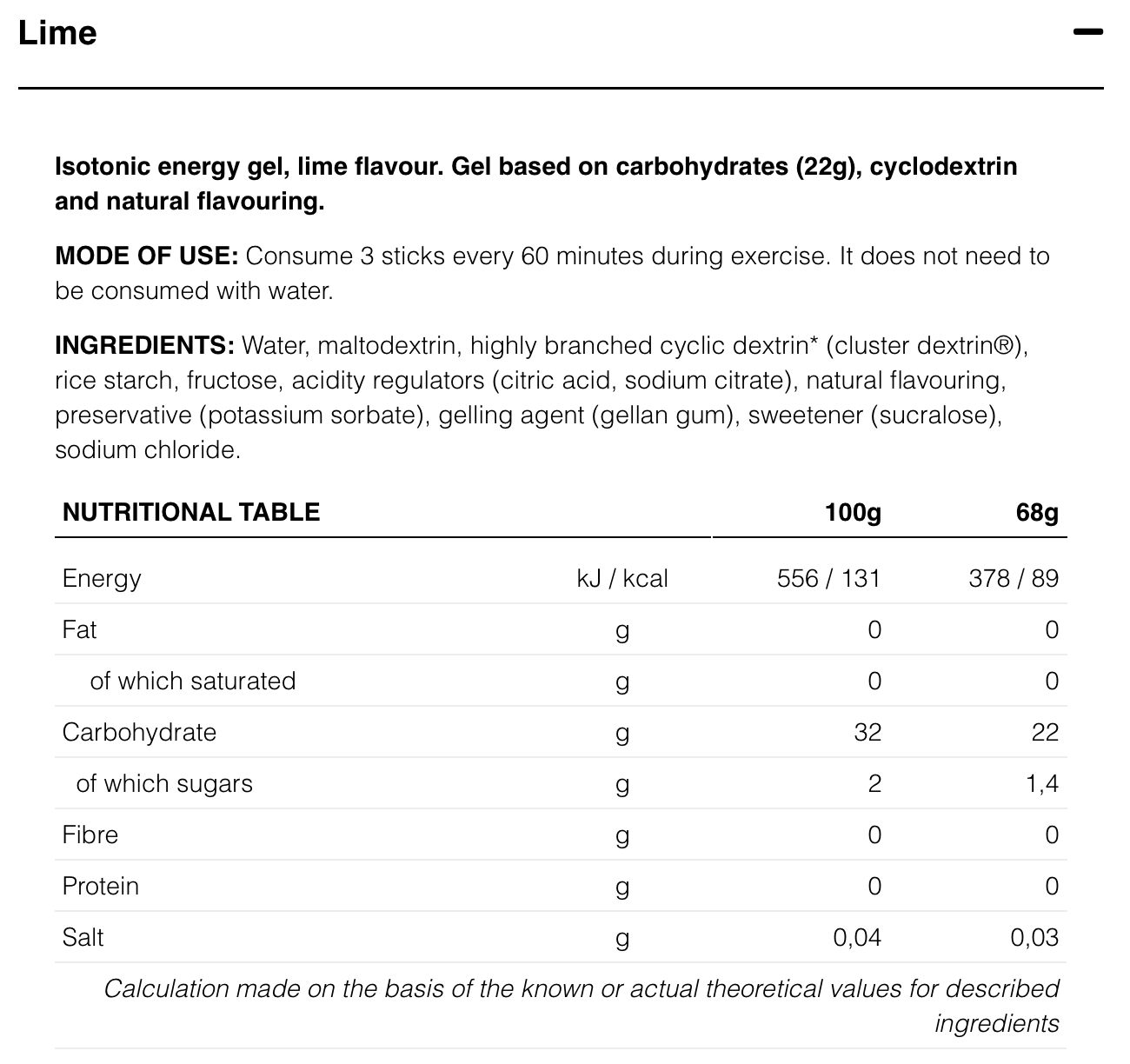 Isotonic energy gel with cyclodextrin, natural aromas and stevia.