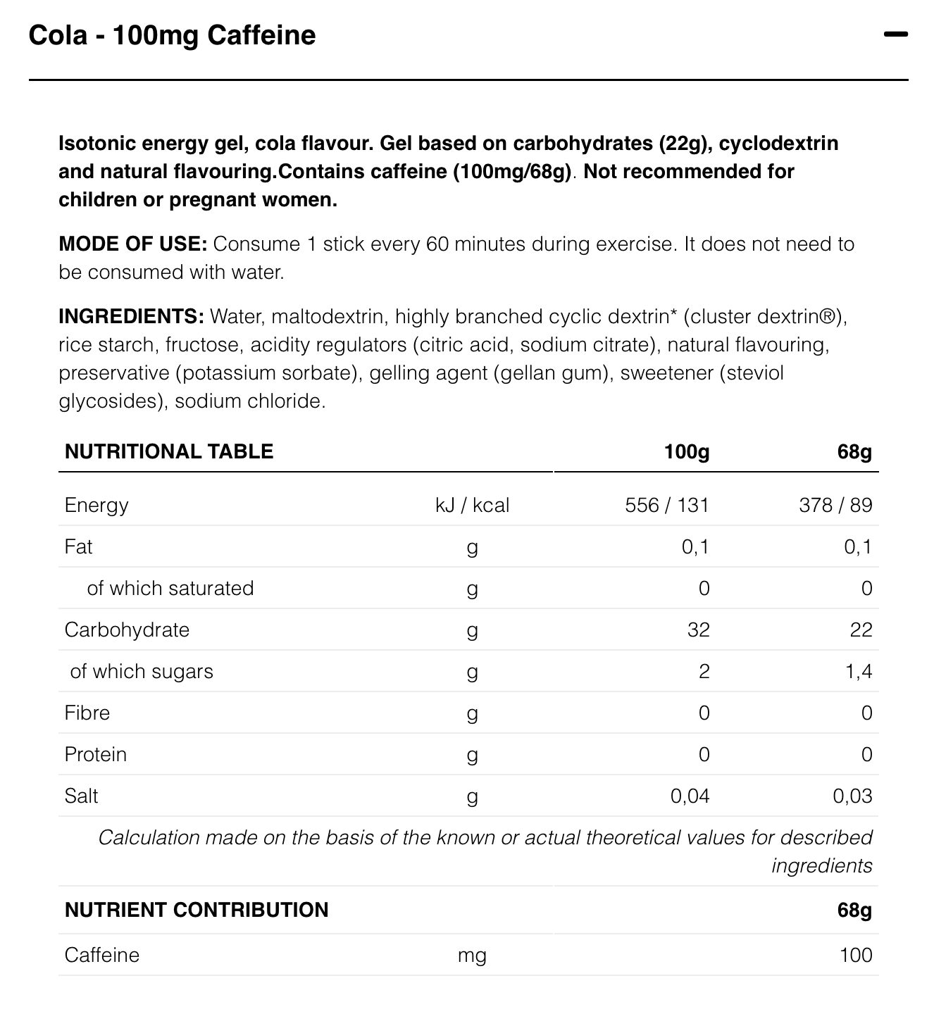 In a 68-g, 89-kcal stick format, it contains 22 g of carbohydrates per unit, of which practically the entirety are complex hydrates and only 1.4 g is sugar.