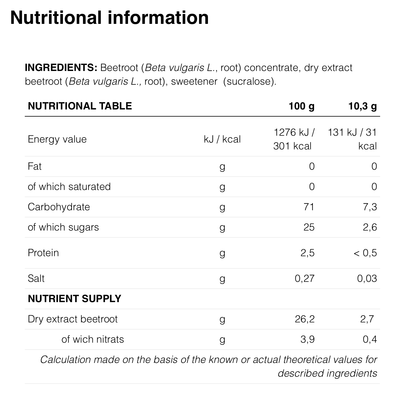 It is a gluten-free drink suitable for vegans based on beetroot concentrate and dry beetroot extract.