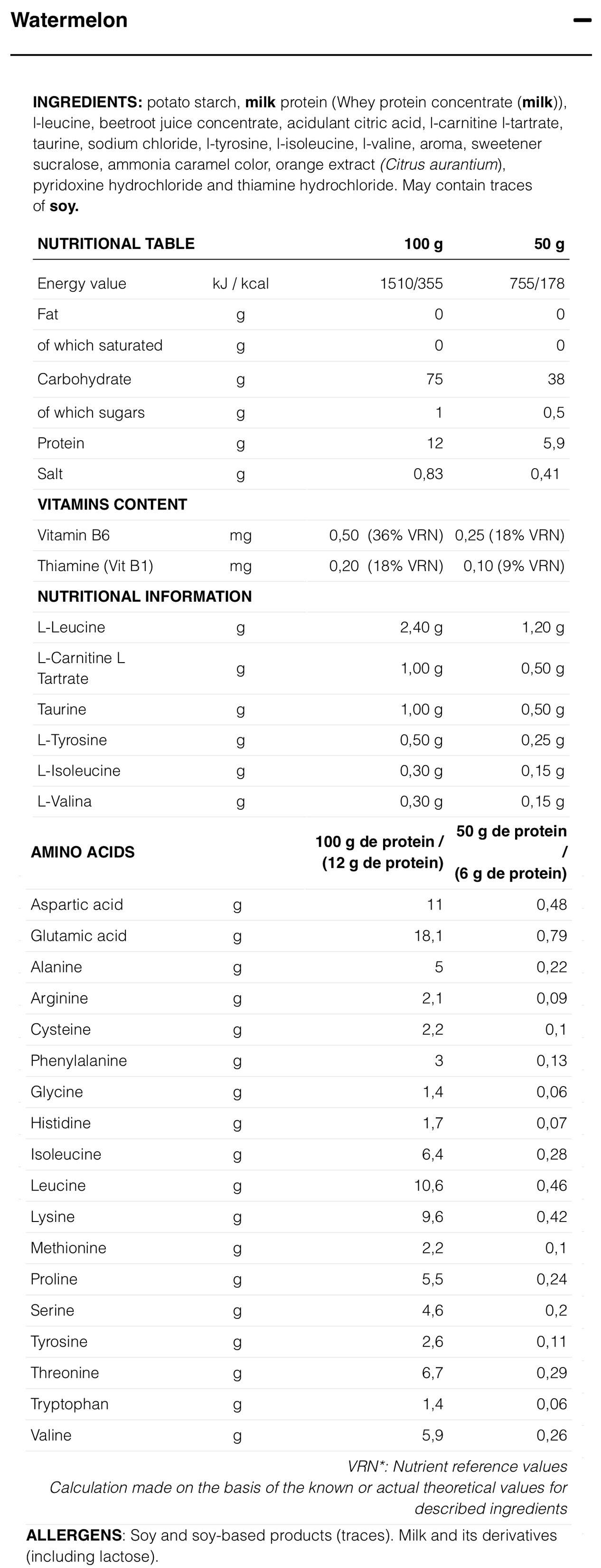 This original product provides sufficient carbohydrates to ensure the energy needed for sporting performance, as well as fast-assimilation proteins and BCAA 8:1:1. It also provides sodium, the mineral our body most consumes during exercise.